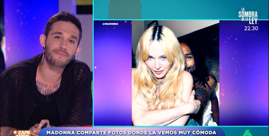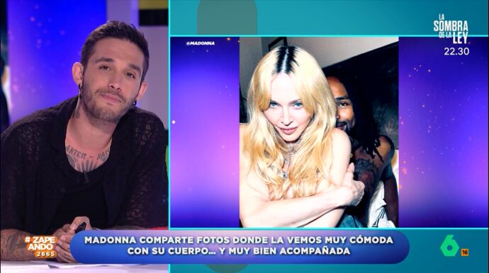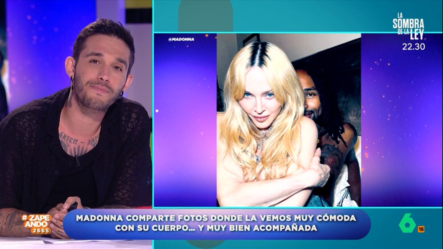Madonna ha compartido unas imágenes en su perfil de Instagram en la que se la ve desnuda de cintura para arriba "tapada únicamente por su pelo", explica Víctor Elías. La artista, además, ha incluido una imagen en la que se puede ver un joven con ella. "¿Será un nuevo novio? ¿Será un rollete? No lo sabemos porque Madonna no lo ha presentado todavía", añade el zapeador.