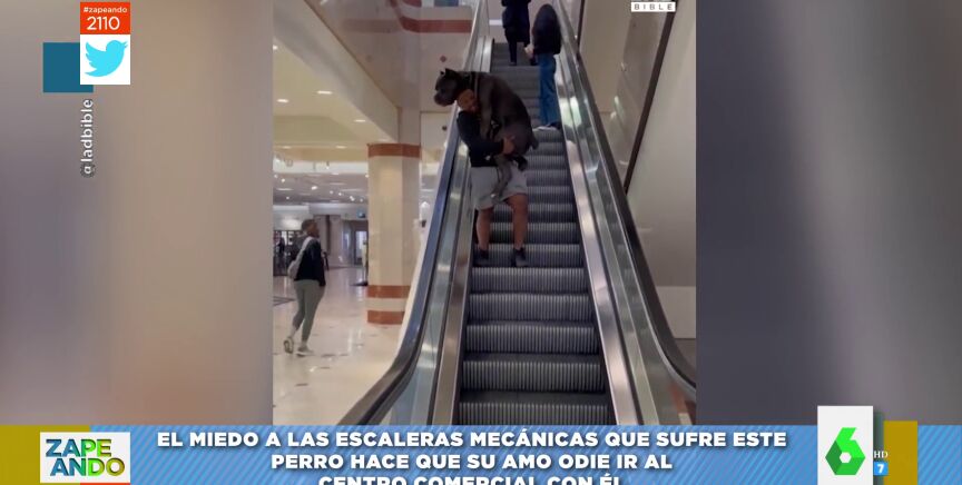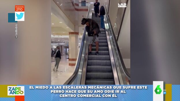 "¿Vosotros sabéis lo que es la escalofobia?", pregunta Lorena Castell a sus compis de Zapeando, para después informarles de que se trata nada más y nada menos que del miedo a las escaleras mecánicas. Como el que sufre el perro de este vídeo viral, al que su dueño tiene que coger en brazos siempre que van al centro comercial a pesar de tener el tamaño de un "purasangre".