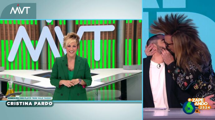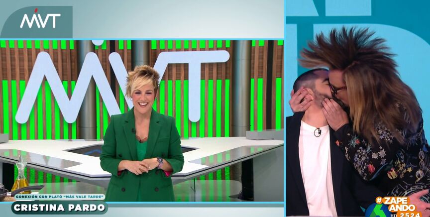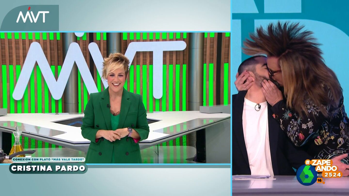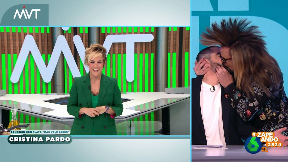 Pero, el colaborador no se da por vencido y corre hacia el presentador, le coge la cabeza y le dedica a Cristina Pardo el beso que le da, finalmente, a Dani Mateo: "Va por ti".