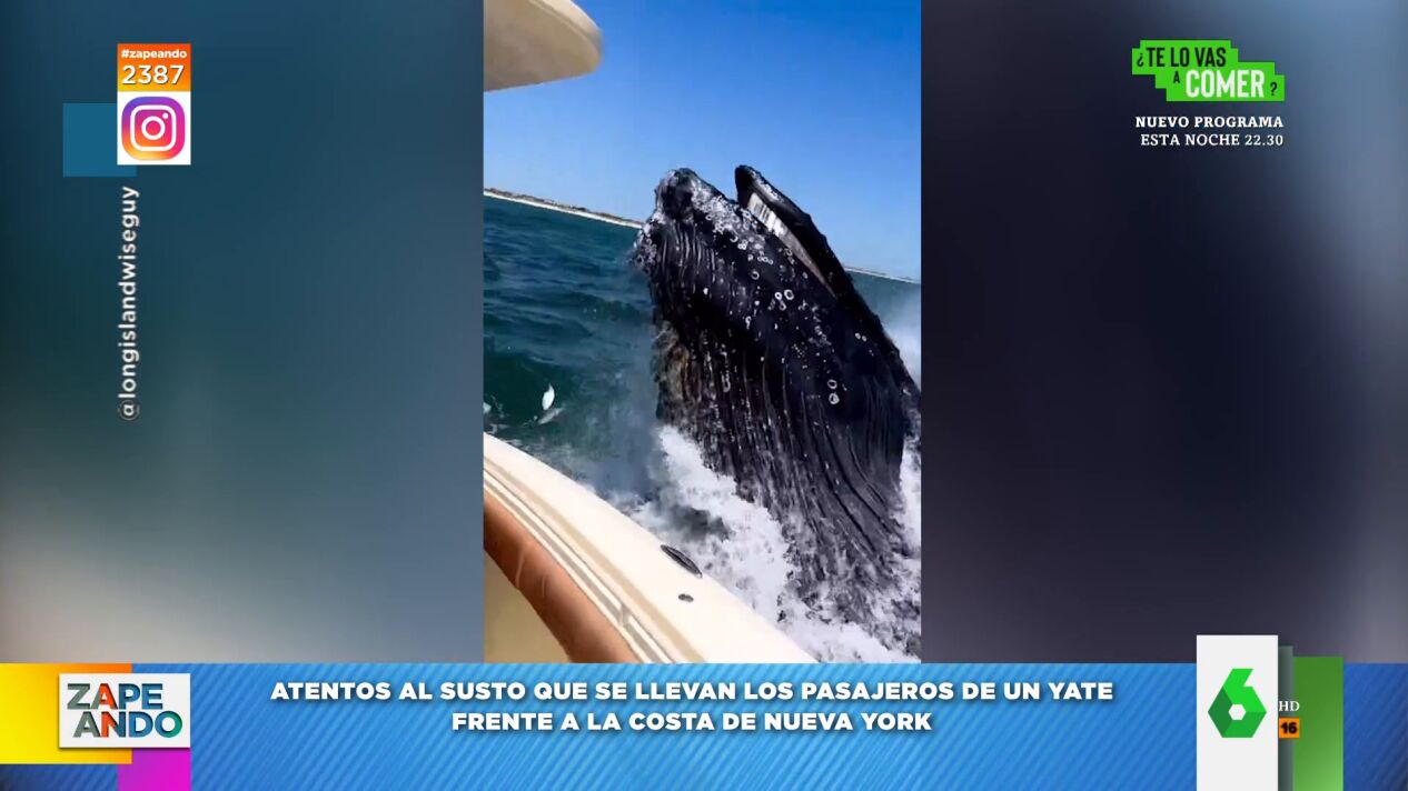 Una ballena sale a la superficie de repente justo al lado de un yate causando una gran sobresalto entre sus pasajeros, que comenzaron a gritar. "Solo come plancton, solo quiere jugar. No es un tren descontrolado sin conductor", comenta Quique Peinado.