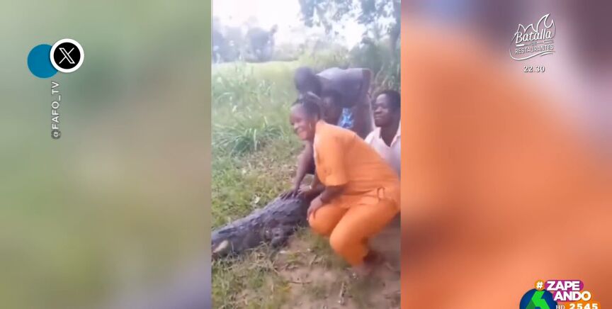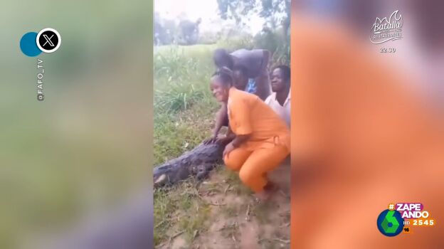 Varias personas se acercan a un cocodrilo, que permanece inmóvil, hasta que, de repente, se revuelve y dirige su boca hacia una de ellas con intención de morderle. Puedes verlo en este vídeo de Zapeando.