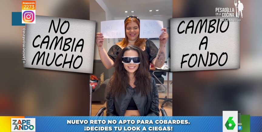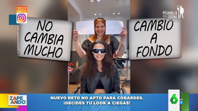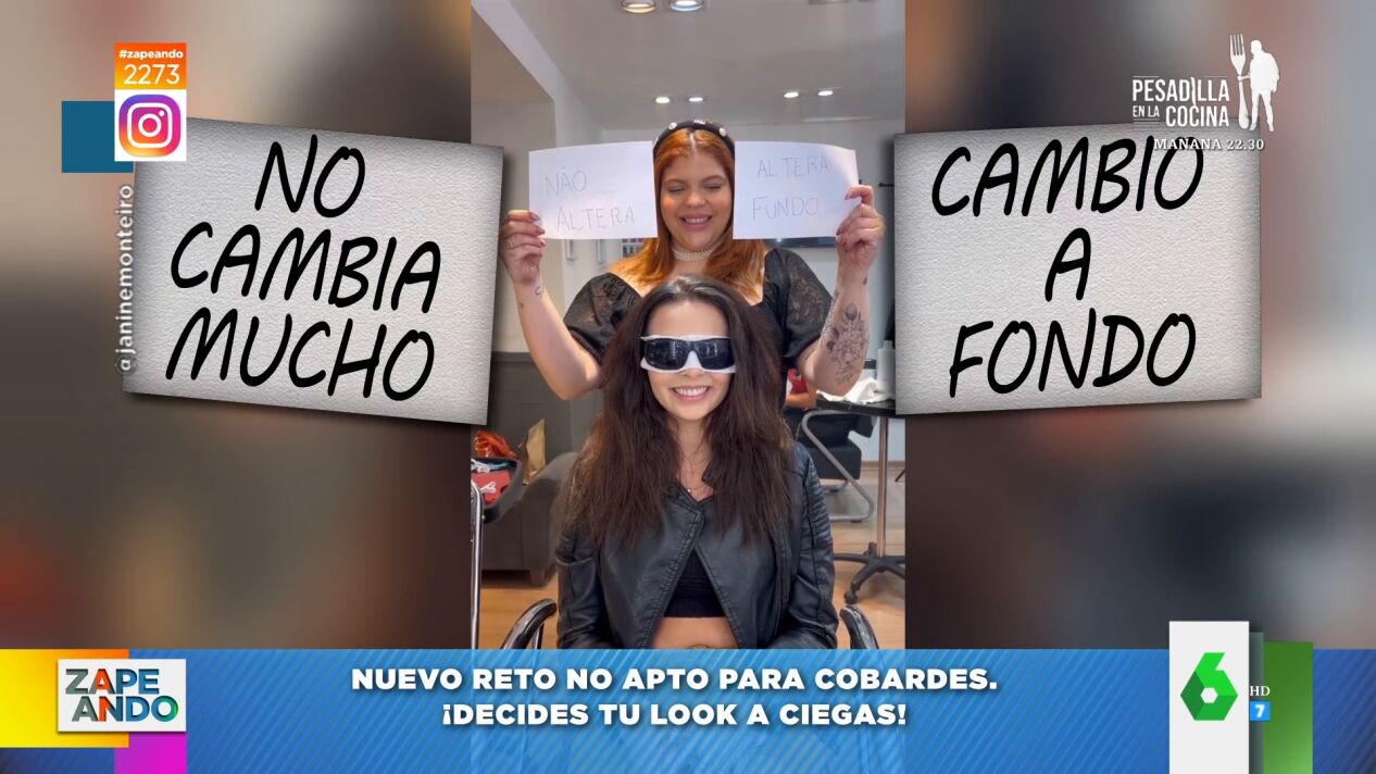 "Atentos a este nievo trend que nos ha vuelto loquísimos", anuncia María Gómez a sus compis de Zapeando, a los que muestra el vídeo viral que refleja en qué consiste: "Tienes que tomar decisiones eligiendo entre dos tarjetas, pero tú no puedes ver las opciones que muestran las tarjetas". Es decir, el reto al que se somete la protagonista de este viral consiste en escoger su cambio de look a ciegas. Para ello la peluquera le tapa los ojos y le da dos opciones entre las que elegir: "Es decir, que toma las decisiones a boleo".
