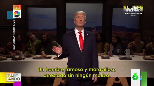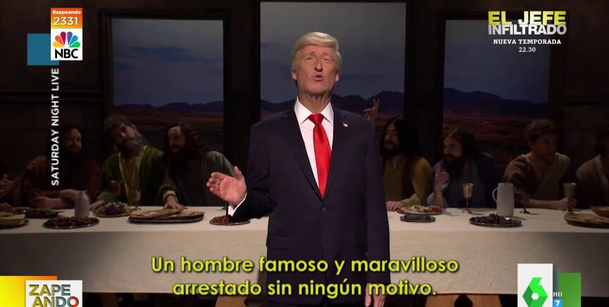 "¿Os suena de algo?", irrumpe un hombre en plató interpretando a Donald Trump, lo que provoca las risas en el programa. "Un hombre famoso y maravilloso arrestado sin ningún motivo", continúa con su discurso, y confirma que "una vez más" se está "comparando con Jesús".