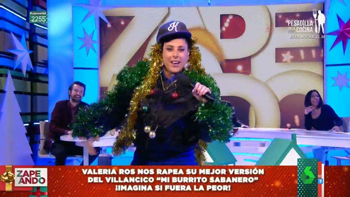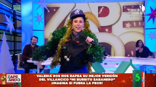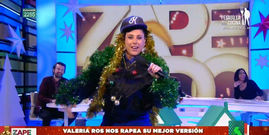 Con tacones y espumillón, Valeria Ros se convierte en el plató de Zapeando en 'Valeria Baby', para protagonizar una cómica actuación de rap en directo. "¡Quiero ese público arriba!", arranca la zapeadora, que comienza a rimar sin parar.