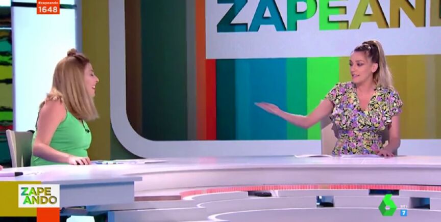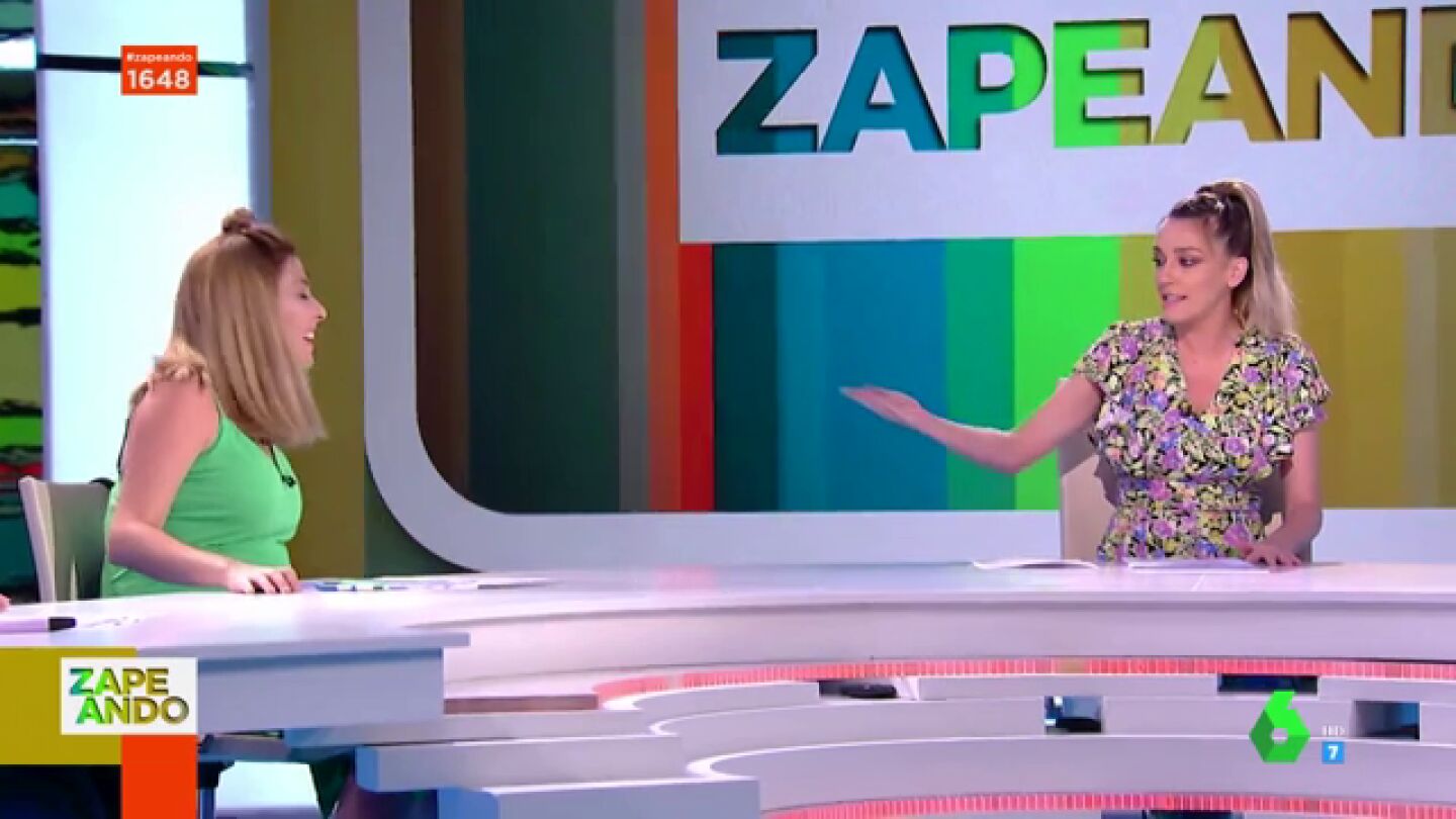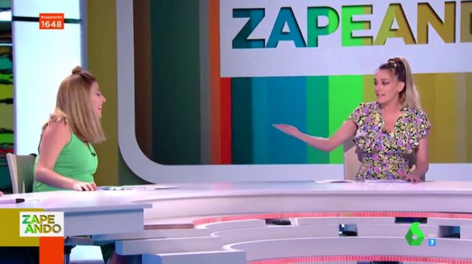 "Perdón, lo siento, además es horrible", destaca Valeria Ros, que explica que lleva el bolso porque lleva un libro que lee antes de empezar. "Es una manía mía un poco de abuela", confiesa la zapeadora.