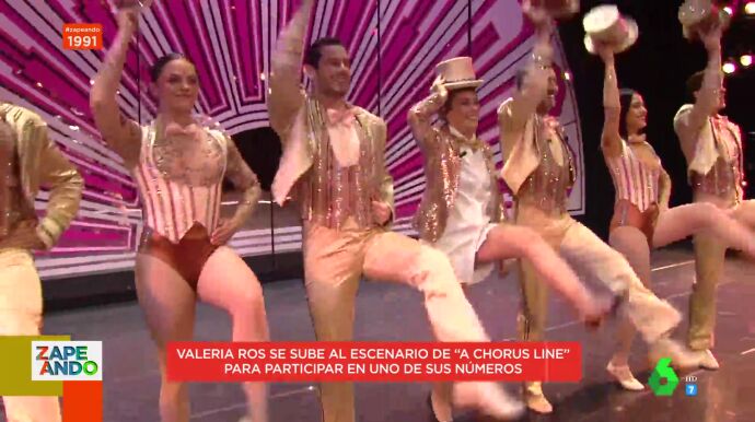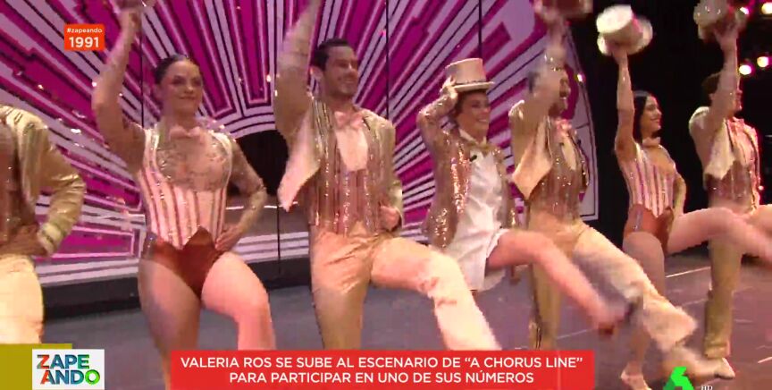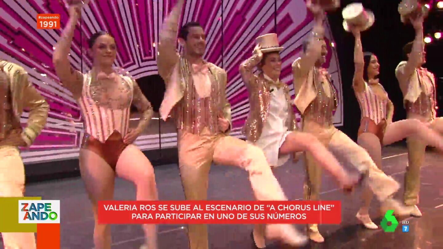 Valeria Ros acude al teatro Calderón en Madrid para participar en uno de los números del espectáculo 'A Chorus Line', protagonizado por Manuel Bandera. Después de realizarle una divertido audición, el actor comienza el espectáculo con la zapeadora vasca y el resto de bailarines.