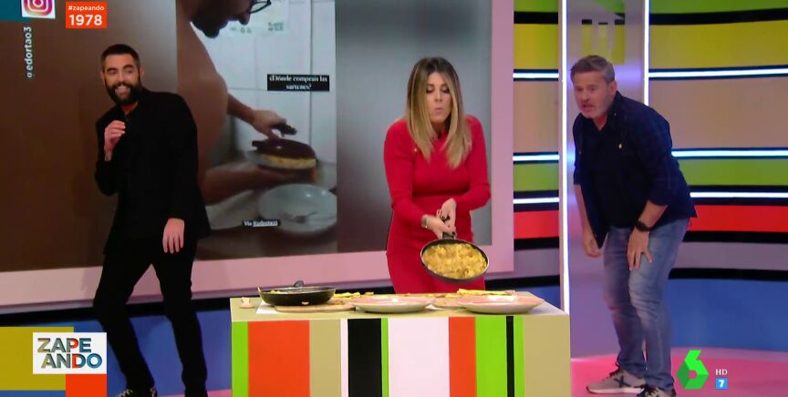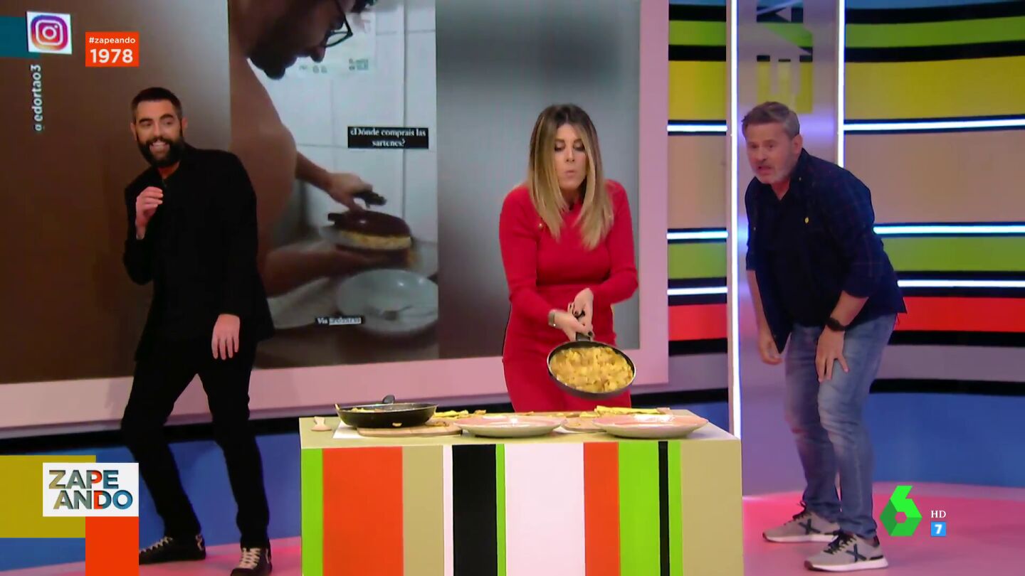 Dani Mateo somete a Valeria Ros a un cómico reto en el plató de Zapeando: darle la vuelta a una tortilla de patata en pleno directo y con ayuda de un experto como Miki Nadal, que le va dando trucos sin tocar las sartenes a su compañera.