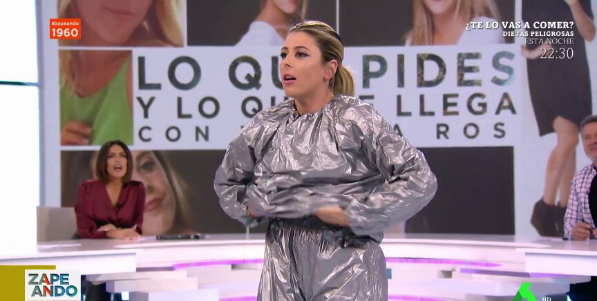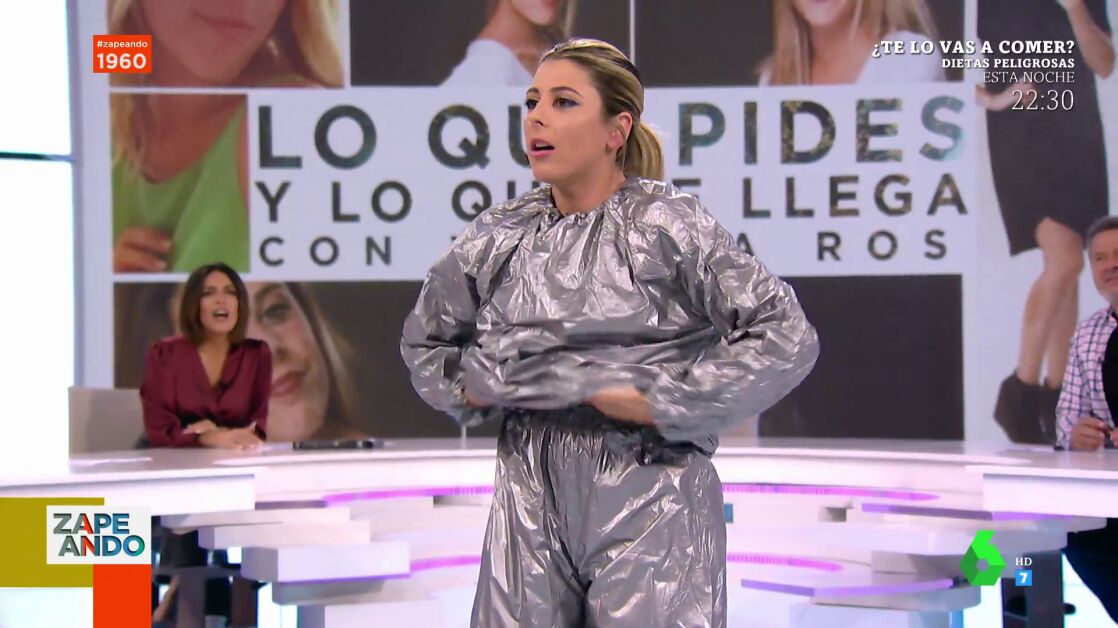 Valeria Ros presenta en el plató de Zapeando su conocida sección 'Lo que compras y lo que te llega', donde la zapeadora vasca prueba en directo los productos que ha comprado a través de las redes sociales. En este vídeo se puede ver cómo llega al plató vestida con un 'traje de sauna' para llevar a cabo su plan detox.
