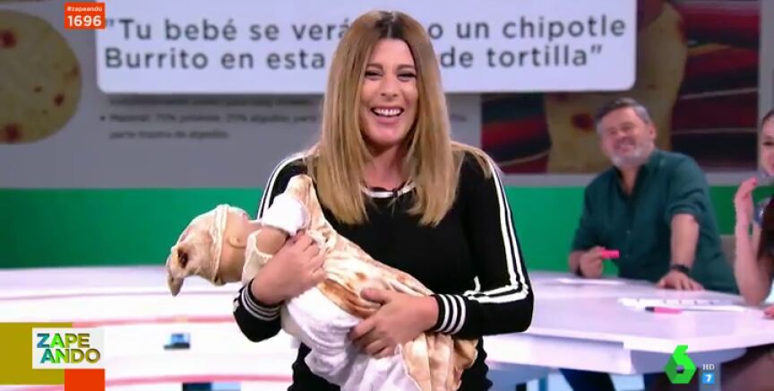 Valeria Ros 'ensaya' con un bebé en el plató a pocas semanas de dar a luz a su hija: "¿Me queda bien?"