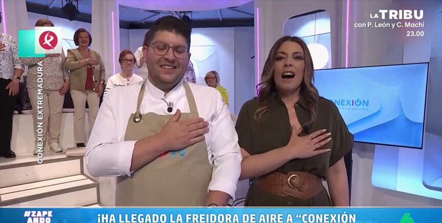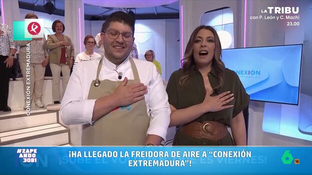 Como se puede ver en las imágenes sobre estas líneas, comienza a sonar una canción que anuncia la llegada de la freidora de aire. "Ha llegado tarde, pero ha llegado", dice el tema. "Qué maravilla", afirma Pedro Collado, el cocinero. "¿Se puede estar convirtiendo 'Conexión Extremadura' en mi programa favorito trabajando yo en otros dos?", plantea Dani Mateo.
