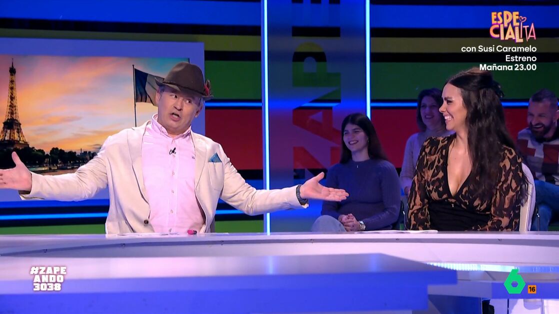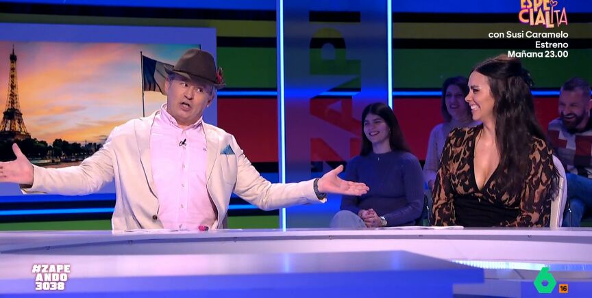Para saber si, realmente, ha bajado tanto la demografía en Francia, Zapeando cuenta con "el ilustre 'embajador francés Emmanuel Sobon'", anuncia Dani Mateo. Lo primero que hace el 'francés' es acercarse a Cristina para presentarse y darle tres besos.