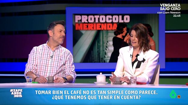 María José Gómez y Verdú visita Zapeando para compartir más consejos sobre protocolo y etiqueta. En esta ocasión, la experta quiere enseñar a los zapeadores todas las normas que existen para tomar un café. Iñaki Urrutia le da una taza de esta bebida, con su plato y sus cubiertos para que lo muestre.