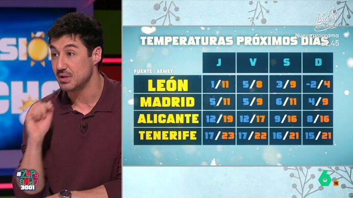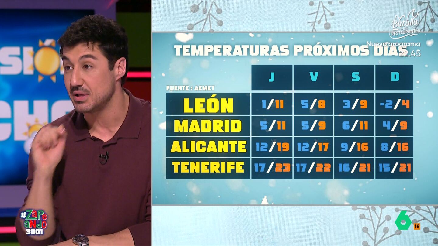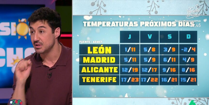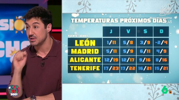 En el caso de la Comunidad de Madrid, las temperaturas máximas rondarán los nueve grados y, según señala, "va a nevar en el norte". Por el contrario, en Alicante "como mucho habrá 16 grados", mientras que recomienda viajar a Tenerife, donde este fin de semana las temperaturas alcanzarán los 23 grados.