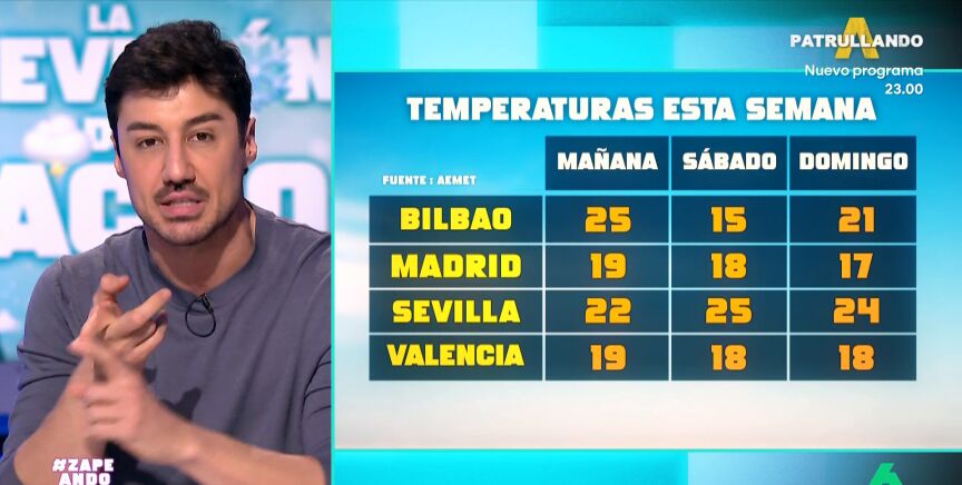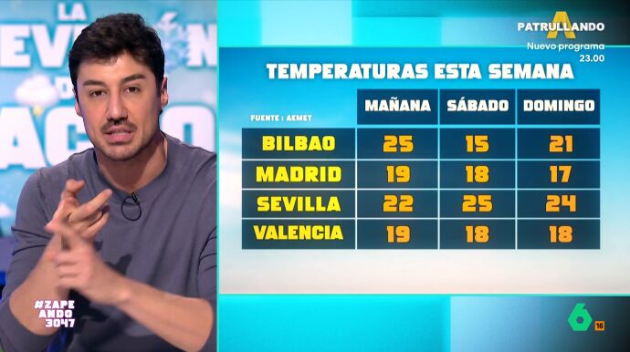 Francisco Cacho ha visitado el plató de Zapeando para avanzar la previsión del tiempo de los próximos días. El meteorólogo ha explicado qué pasará con las lluvias y ha destacado temperaturas poco habituales para esta época del año.