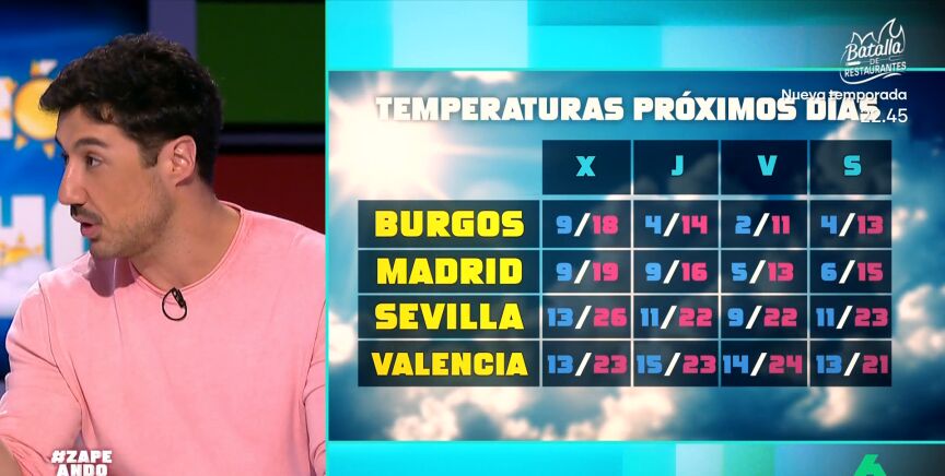Asimismo, Francisco Cacho detalla que a partir del próximo jueves "van a bajar mucho la temperatura" y que va a ser necesario el abrigo. "Jueves y viernes en muchos puntos del norte, por ejemplo en Castilla y León las máximas van a estar por debajo de los 11 grados, que ya es casi invierno", apostilla el colaborador.