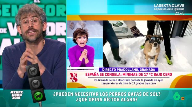 El veterinario Víctor Algra vuelve a Zapeando con su 'semáforo' para desvelar qué opina sobre algunas tendencias en el mundo de las mascotas. En esta ocasión, va a dar su opinión sobre un complemento para perros: las gafas de sol.
