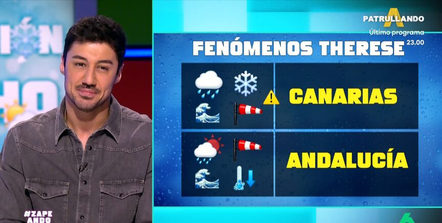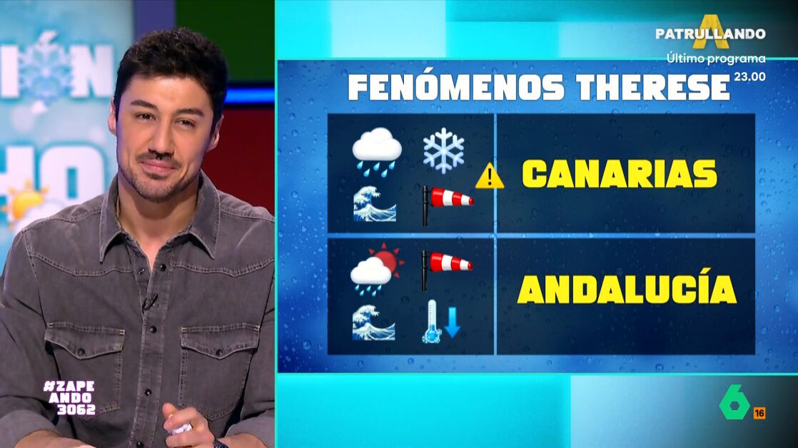 Entre mañana y el jueves Therese llega a Canarias, donde "se va a liar muchísimo". El meteorólogo de laSexta señala que va a llover mucho y nevará en el Teide en marzo, además del viento y el oleaje. De hecho, ya hay aviso naranja a 48 horas de que llegue el temporal, lo que no es habitual.