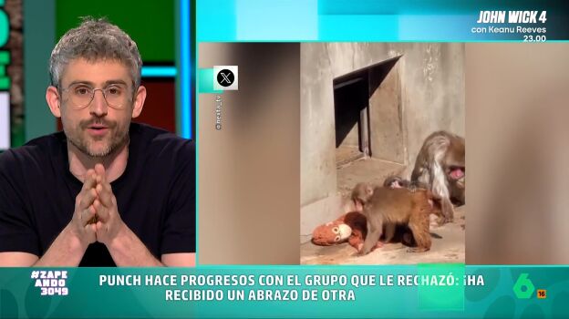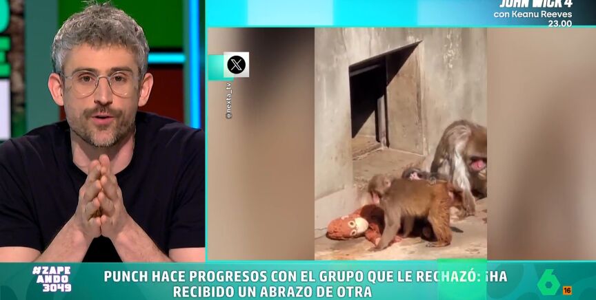 "Todos se arriman a la fama", comenta Dani Mateo. El veterinario señala que ha habido acercamientos con el resto del grupo y que, incluso, se ha podido ver como otra primate le da un abrazo. "Esto es un gesto que le ayuda a integrarse con el clan", explica Algra.
