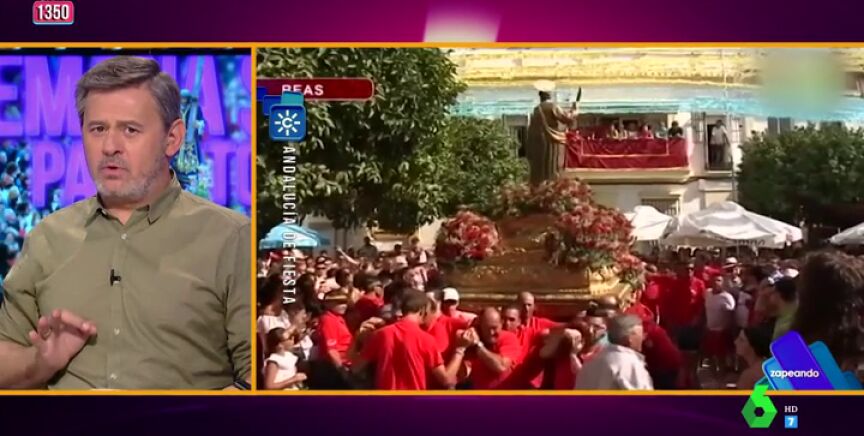 Cristina Pedroche nos enseña en Zapeando una procesión que desfila entre los bañistas de la Playa de Malvarrosa, en Valencia. O la de un pueblo de Huelva, en la que los cofrades bailan con el santo por sevillanas y al ritmo de Paquito El Chocolatero'.