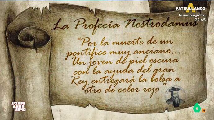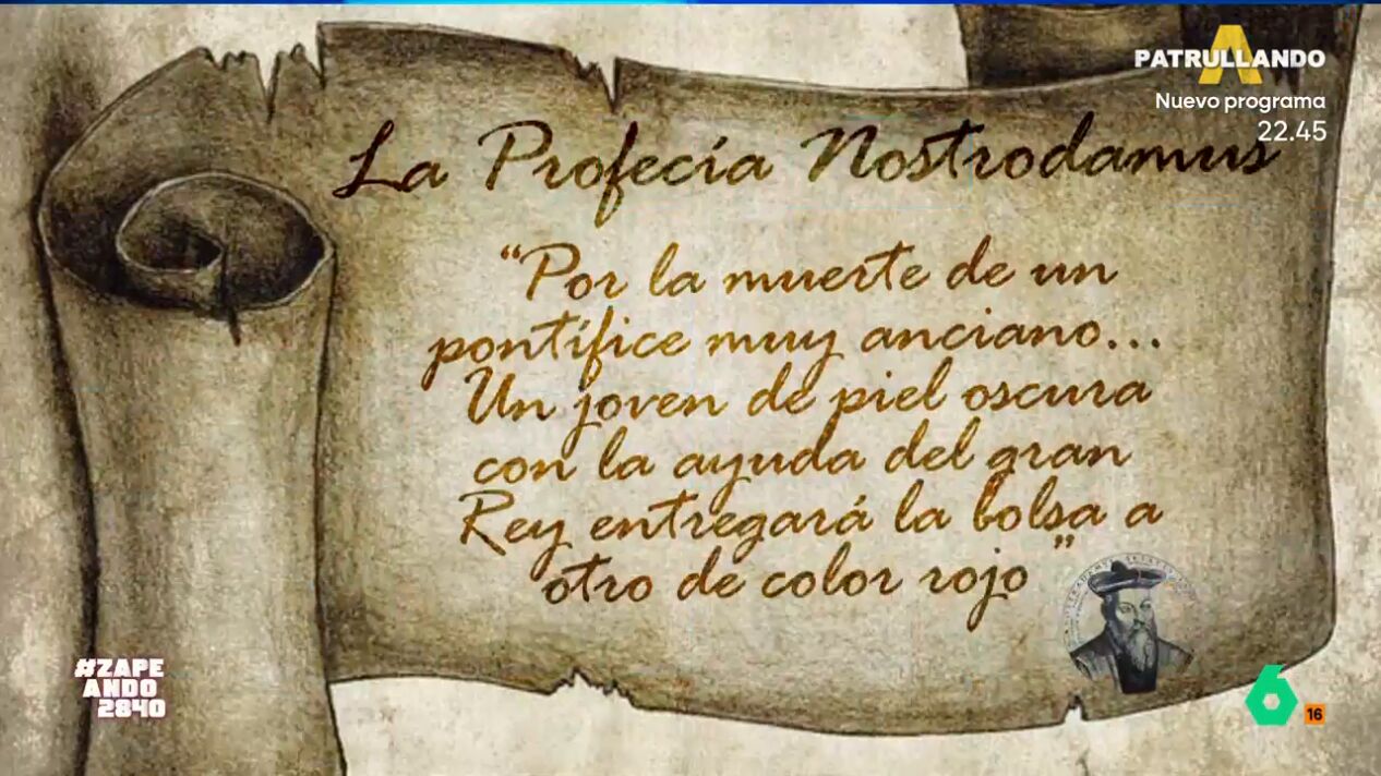"Nostradamus anuncia que llegará un papa negro que desatará el apocalipsis", traduce la zapeadora en el vídeo sobre estos líneas. Sin embargo, Nacho García apunta que "hay muchísimos papas de colores, no se sabe si anuncia el fin del mundo o la vuelta de Parchís". Dani Mateo tampoco lo ve claro, pues para él "el papa más rojo que ha habido es este que se acaba de morir".
