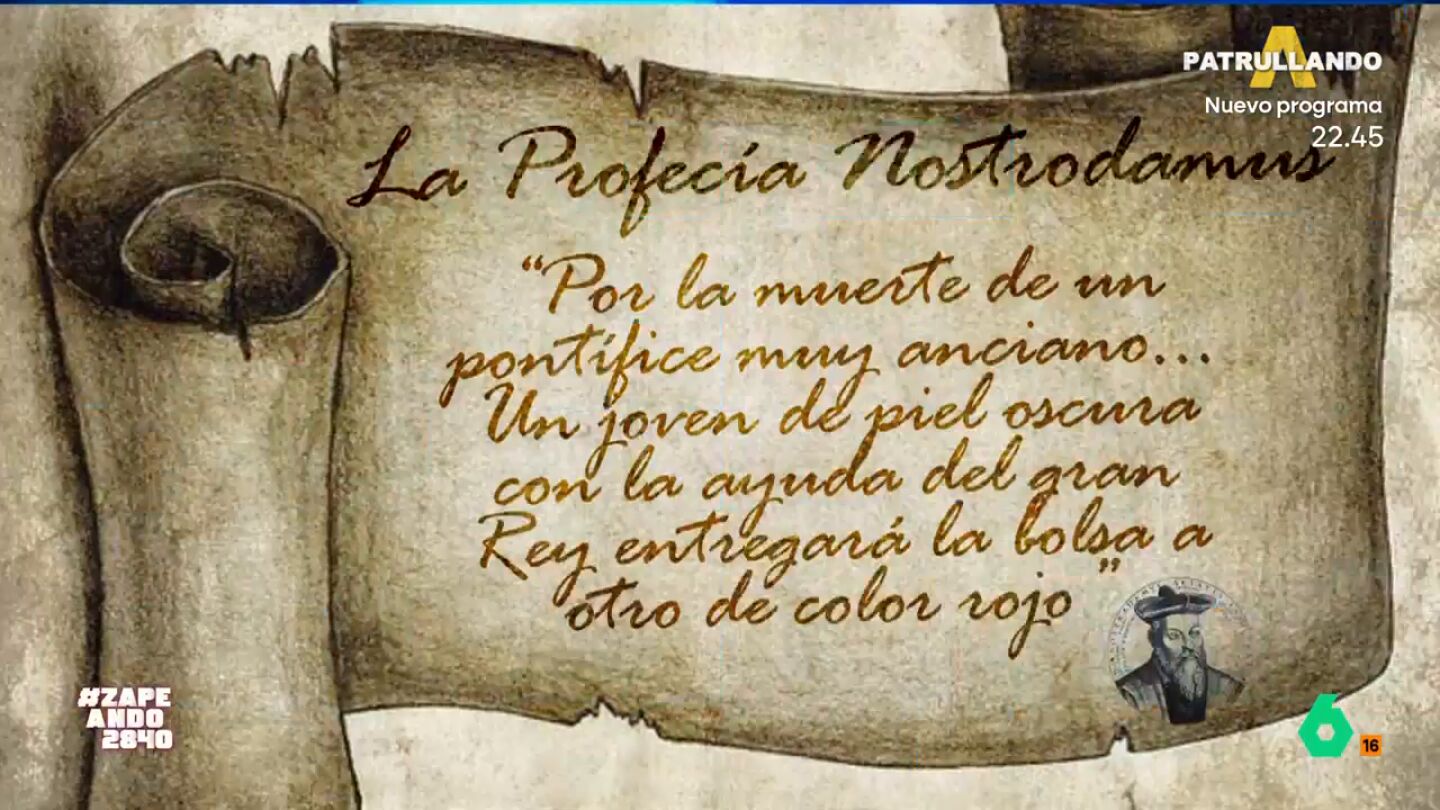 "Por la muerte de un pontífice muy anciano un joven de piel oscura, con la ayuda del gran Rey, entregará la bolsa a otro de color rojo", profetizaba Nostradamus, aunque Nacho García y Dani Mateo le ven lagunas.