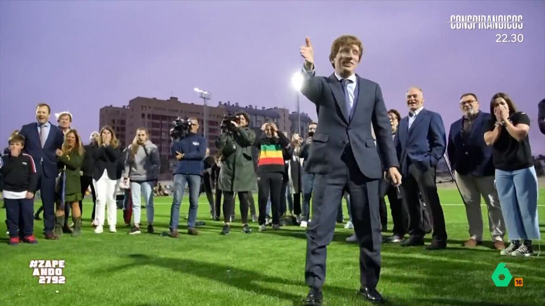 Como se puede ver en las imágenes, el programa recuerda alguno de estos 'accidentes' que terminaron en forma de balonazos a personas como periodistas o niños. Y tampoco ha faltado su 'salto' en una cama elástica. A pesar de que dos monitores del centro deportivo intentan que de una voltereta, el alcalde termina 'aterrizando' de cabeza en el foso, algo que provoca las risas de los asistentes. "¡Y voló...! Pobrecito, cuando Almeida coge un balón no hay nadie a salvo, es el único político que en lugar de escolta lleva un enfermero", afirma Nacho García.