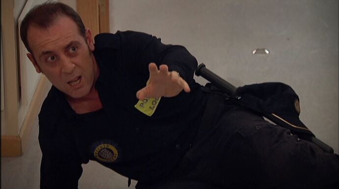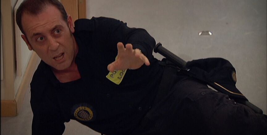 La contundencia y sangre fría con la que actúa hace que el policía se libre del atracador y salve así su vida.