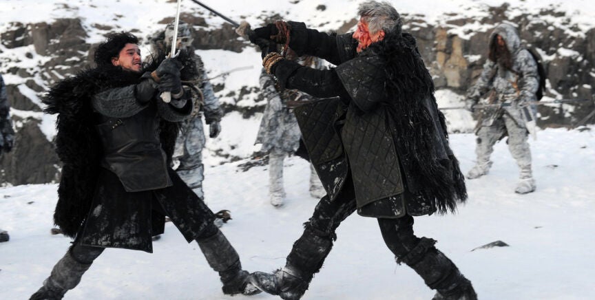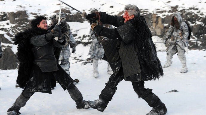 Más allá del Muro, Jon Nieve se tiene que ganar la confianza de Ygritte y los salvajes aunque con ello tenga que matar a Qhorin Mediamano para conseguir llegar a Mance Rayder y acabar con él. No hay que olvidarse de Grenn, Edd y Samwell Tarly que explorando en el Puño de los Primeros Hombres oyen sonar el cuerno de sus compañeros tres veces. Eso sólo significa una cosa: Caminantes Blancos. Una escena final para terminar la temporada en la que un ejército de no-muertos alza sus espadas de hielo de camino al Muro.