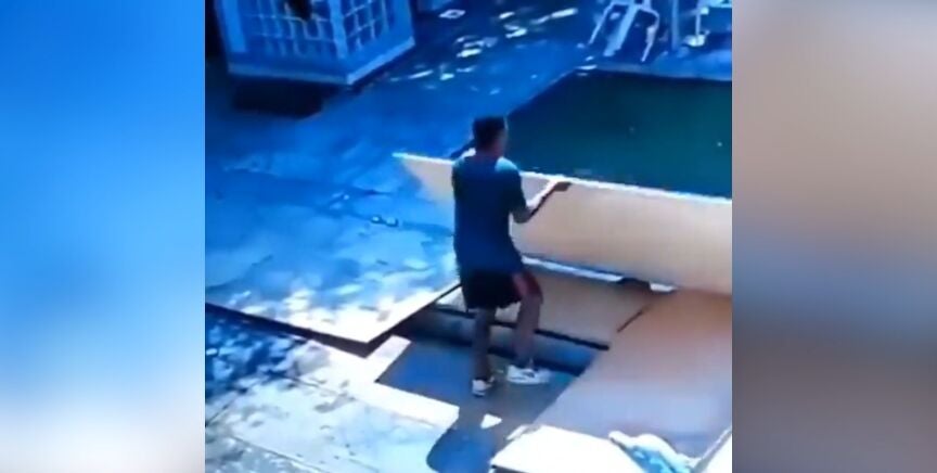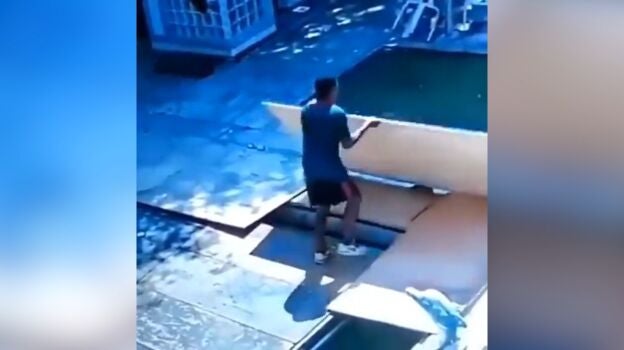 2. Operario: Este operario tiene que levantar unas placas de hierro que hay en el suelo. Seguramente al ser su primer día no tiene mucha soltura. Cuando logra levantarla, se despista y acaba cayendo a un hoyo, y el hierro, vuelve a su lugar original, sin dejar rastro del obrero.