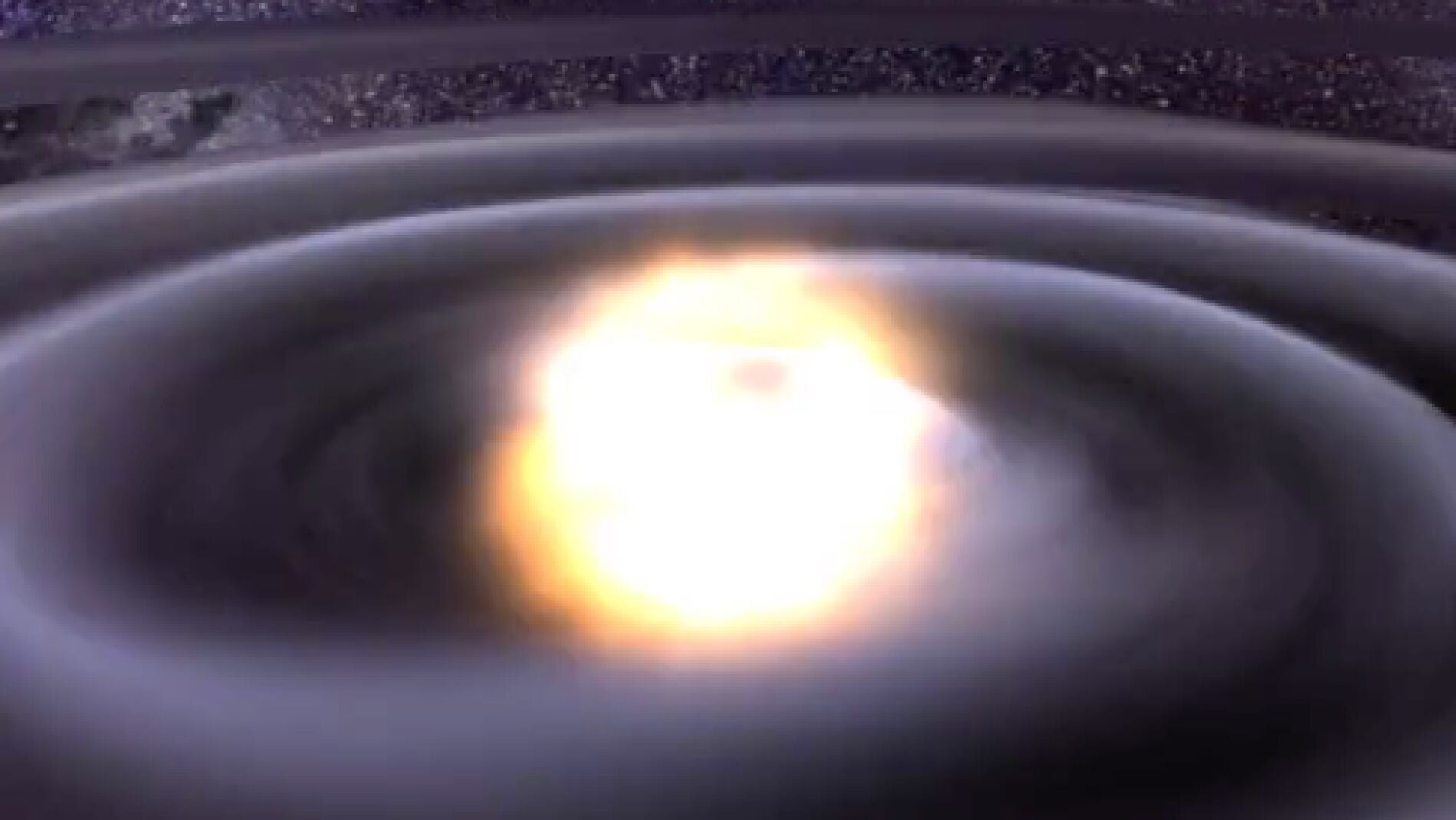 Animación que muestra la fusión de dos estrellas de neutrones y las ondas gravitacionales que producen. Después de la ráfaga de rayos gamma, la nueva estrella de neutrones, más grande, gira a una velocidad mayor.