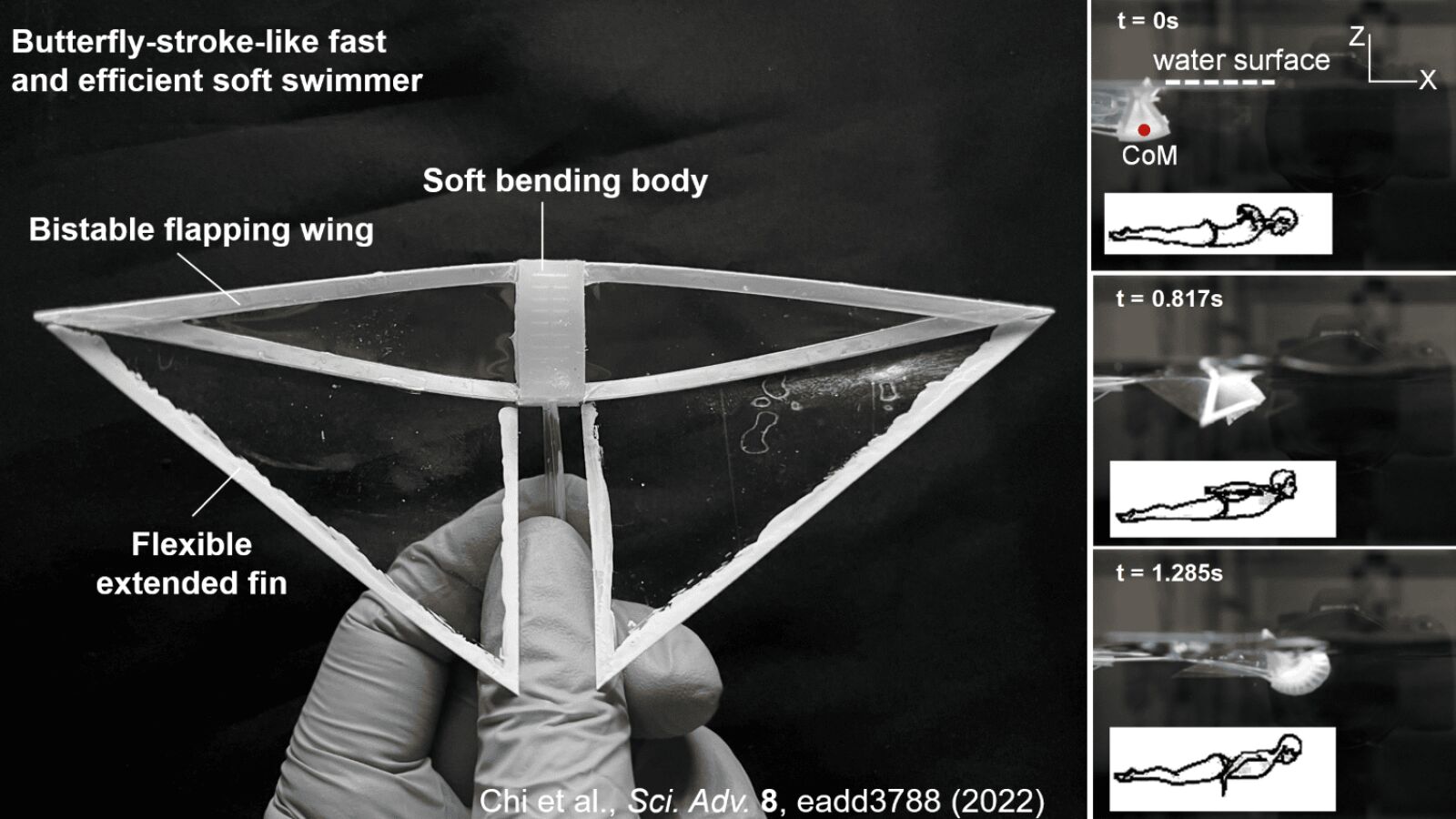 Estos robots se denominan "robot mariposa" porque su movimiento se asemeja a dicho estilo de natación. En la imagen superior se puede apreciar la estructura del robot, que cuenta con un cuerpo de flexión suave, dos alas batientes biestables y otras dos aletas flexibles y extendidas. En la parte de la derecha se puede ver la similitud de los movimientos del robot con los de una persona nadando a estilo mariposa.