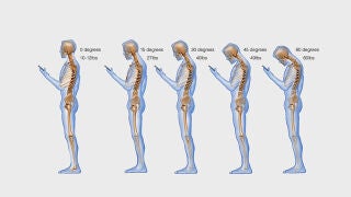 Un estudio médico alerta de que consultar el teléfono móvil equivale a que tus cervicales soporten 27 kilos de peso cada vez que agachas el cuello para leer la pantalla de tu teléfono. Tras la Whatsappitis, ya tenemos nueva dolencia vinculada a las nuevas tecnologías: 'text neck'. Y lo tildan de epidemia.