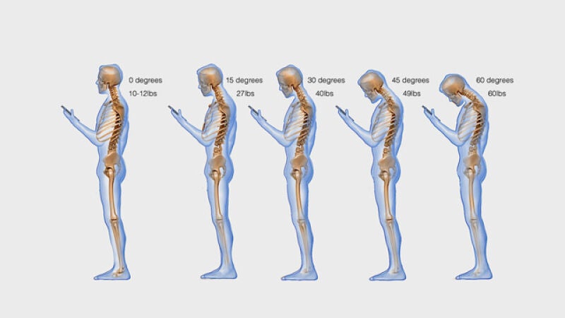 Su artículo desvela que la cabeza de un adulto suele pesar entre cuatro y cinco kilos y medio, pero al inclinarla, en una curva entre 15 y 60 grados hacia la pantalla de un móvil, la presión sobre las cervicales puede aumentar en una escala que va de los 12 a los mencionados 27 kilos.