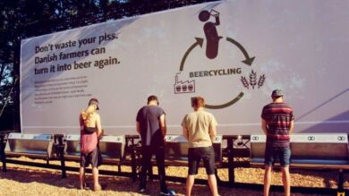 Uno de esos proyectos es ‘Beercycling’ –respaldado por el Consejo Danés de Agricultura y Alimentación - que recogió el pasado año, en el Festival de Roskilde de Dinamarca, la nada despreciable cantidad de 54.000 litros de orina proveniente de bebedores de cerveza y la cual se convirtió en un eficiente fertilizante con el que se abonó amplios campos daneses de cebada y que, tras la cosecha de este cereal, se consiguió recolectar once toneladas de malta con la que se elaboró una cerveza –con el curioso nombre de ‘Nørrebro Pis Ner’- que fue embotellada en 60.000 unidades y servida este año en el mencionado festival de música; realizándose nuevamente el ciclo de recolecta de orina de esa cerveza.