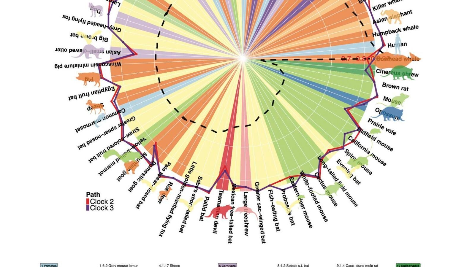 La metilación, por tanto, tal y como se describe en Science, guarda una correlación sustancial con la duración máxima de la vida en todas las especies de mamíferos, y se observan diferencias entre las especies de más larga duración y las menos longevas.