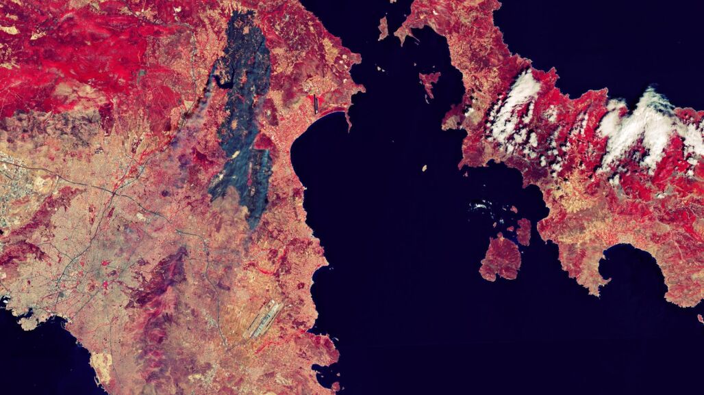 La Agencia Espacial Europea (ESA) ha publicado una imagen satelital del incendio forestal que se ha llegado a extender por varios barrios de las afueras de Atenas, en Grecia; en ella se observa la vegetación en rojo y las zonas quemadas en negro.