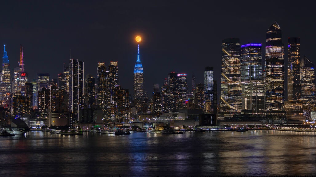 6. La Luna de fresa brilla junto al rascacielos Empire State Building en Nueva York, Estados Unidos.