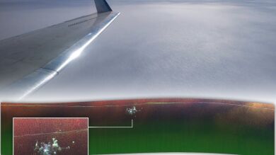 Volando a unos 160 kilómetros al este de la Base Espacial Pituffik de la Space Force de Estados Unidos en el norte de Groenlandia, Greene tomó una foto desde la ventana de la aeronave que muestra la vasta y estéril extensión de la superficie de la capa de hielo. Fue entonces cuando el radar detectó inesperadamente algo enterrado dentro del hielo.