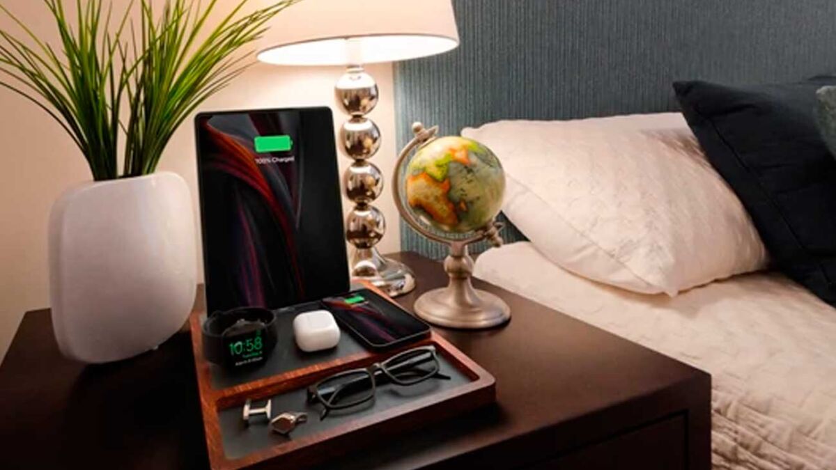 Aunque uno de los dispositivos que más destaca por su diseño y su capacidad de carga de hasta cuatro dispositivos es el NYTSTND QUAD TRAY MagSafe. Una estación de carga multifuncional diseñada en forma de bandeja que dispone de cuatro zonas de carga e incluye un conector Lightning o USB-C para cargas de esta forma un dispositivo adicional. Compatible con el modo mesa de noche del reloj, también podemos mantener en una posición optima de visualización un iPad mientras realizamos la carga, cosa que permitirá haciendo uso de uso. Una solución practica a la vez que elegante para recargar todos nuestros dispositivos inalámbricos al mismo tiempo.