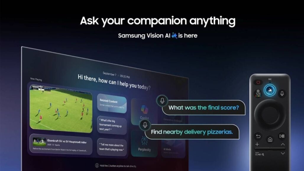 Si has probado a usar comandos de voz en un televisor, sabrás que son muy limitados, ofreciendo una interacción muy básica. En cambio, Samsung Vision AI Companion vitamina a su asistente para ofrecer una interacción natural, fluida, con capacidad para entender el contexto, seguir el hilo de una conversación y mostrar respuestas visuales en pantalla sin interrumpir lo que estás viendo.