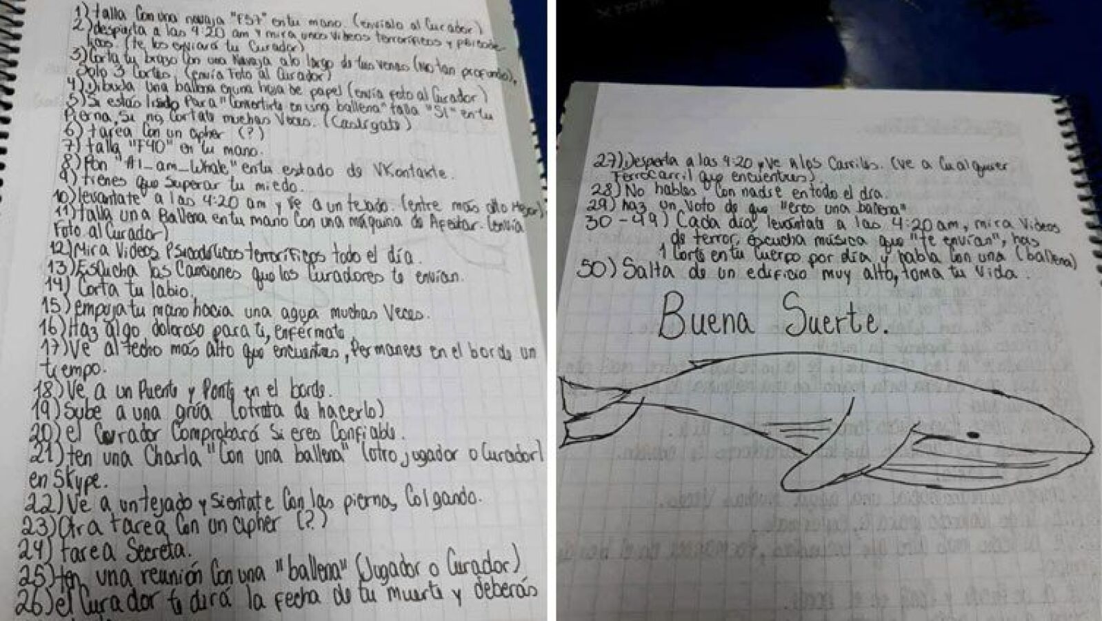 - Los muros de algunas de las víctimas estaban llenos de referencias a la simbología de este juego, la ballena azul, con dibujos, expresiones y fotos inquietantes que podrían haber ayudado a predecir a sus familiares y amigos que algo estaba ocurriendo.