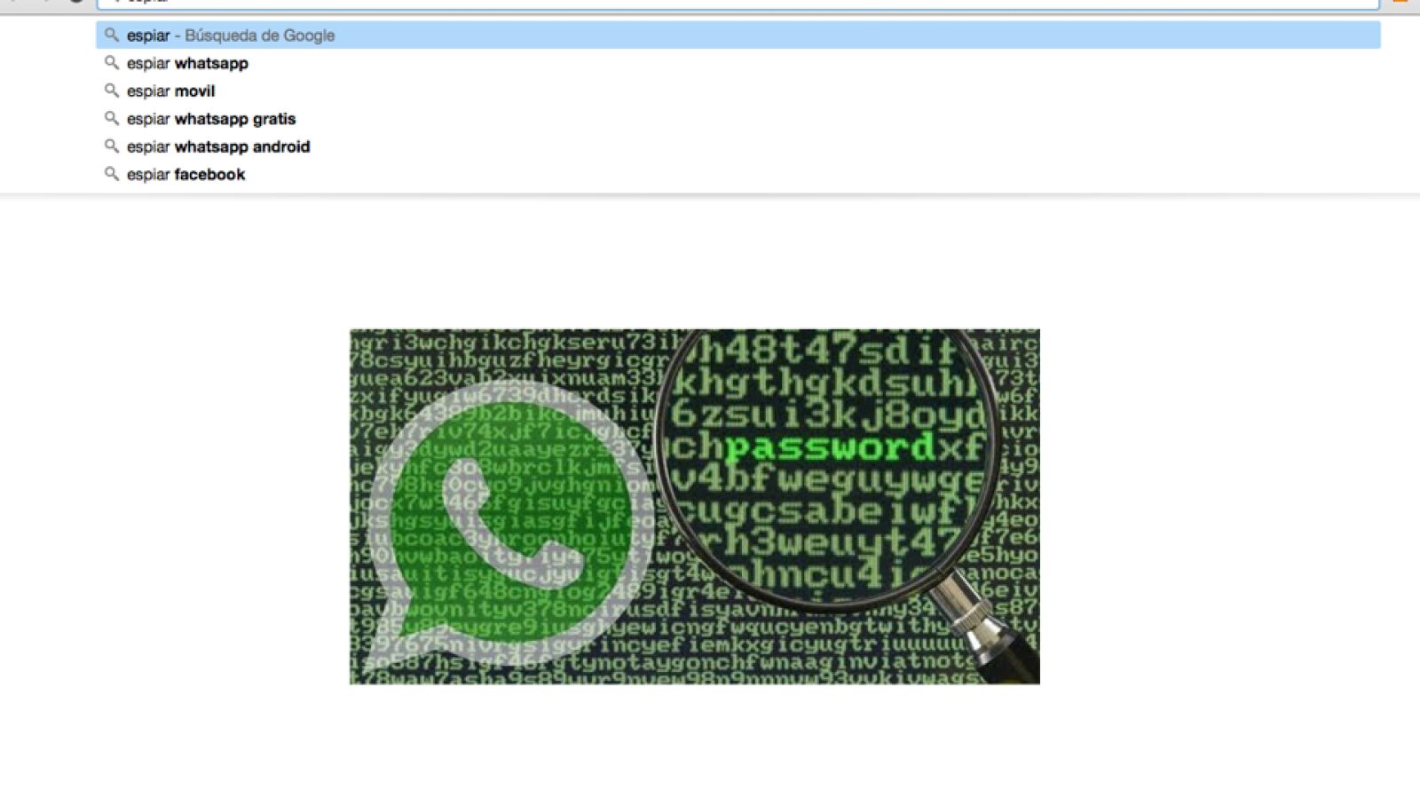 Si introducimos en el buscador Google la palabra “espiar” el resultado… ¿es asombroso? No, al contrario, es muy predecible: “espiar whatsapp”, “espiar móvil”, “espiar Facebook”, “espiar conversaciones”, etc.