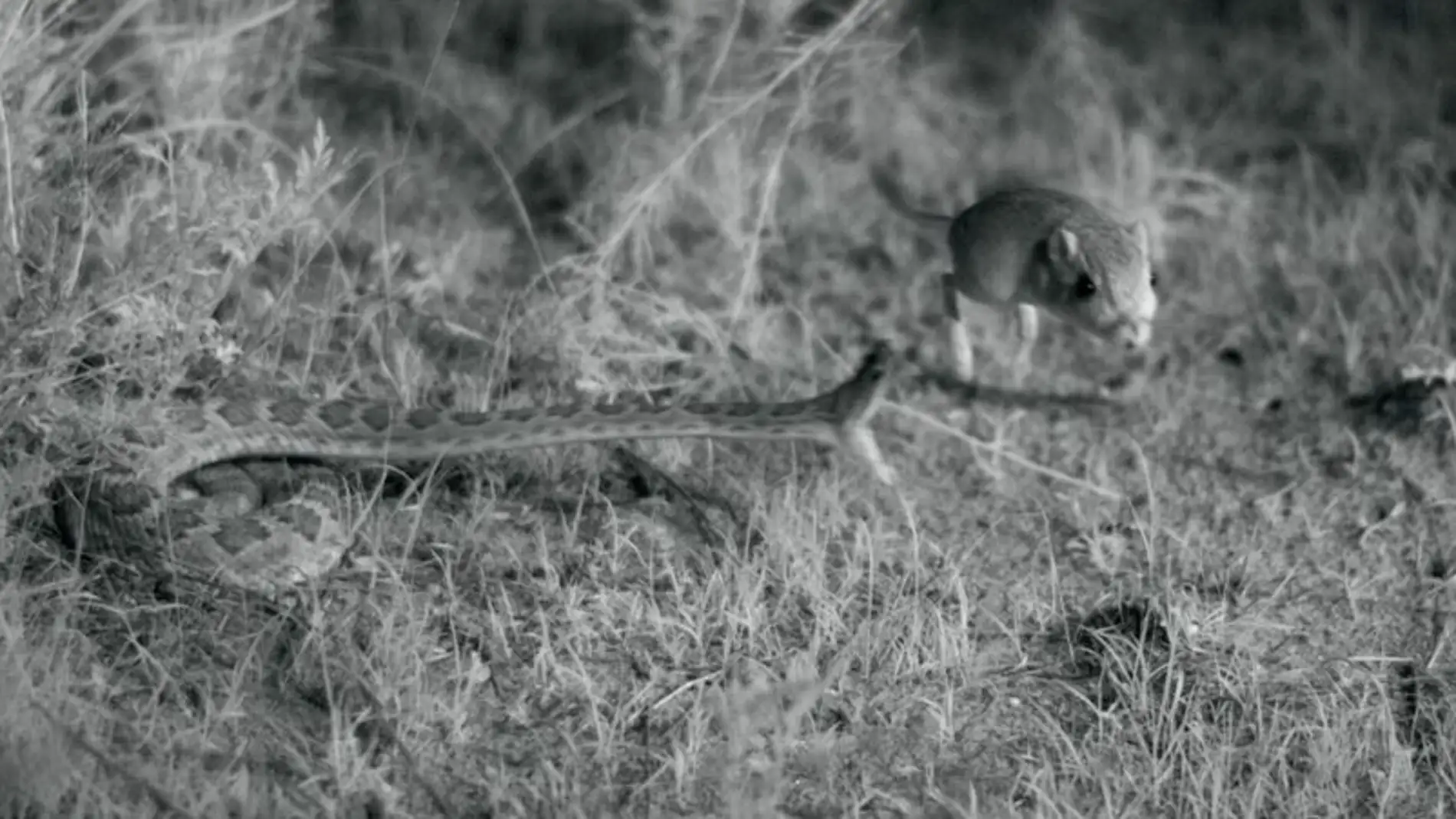 Científicos de la Universidad de California Riverside han logrado grabar el ataque de una serpiente de cascabel a una rata canguro (Dipodomys), en su entorno natural y a velocidad superlenta. Es el primer estudio que cuantifica estos ataques y la capacidad elusiva de la rata canguro.