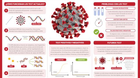 Esta infografía realizada por Compound Interest y traducida al castellano por Claudia Blanco y Fernando Gomollón resume todo el proceso de detección que se está empleando actualmente, explica sus limitaciones y describe cómo serán los futuros test.