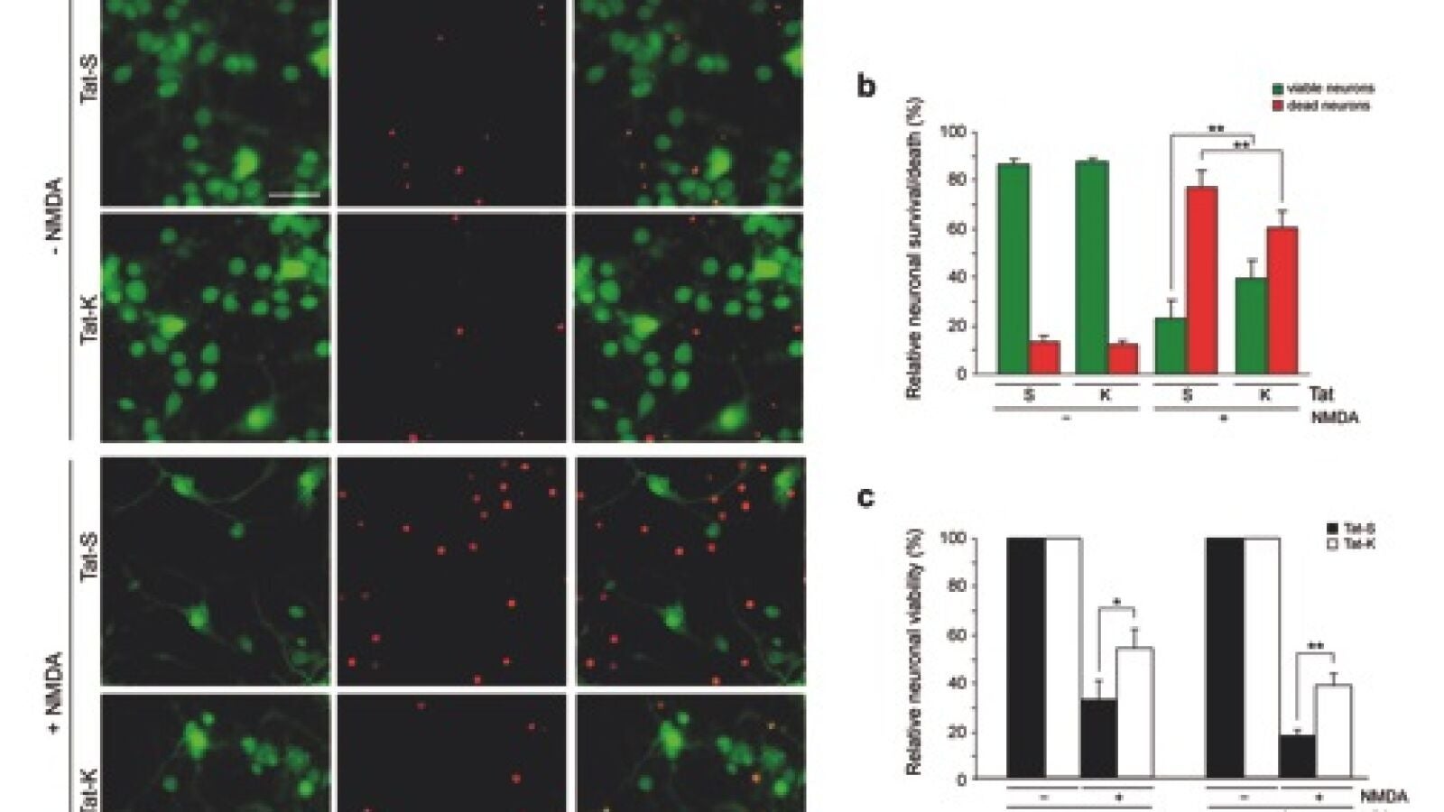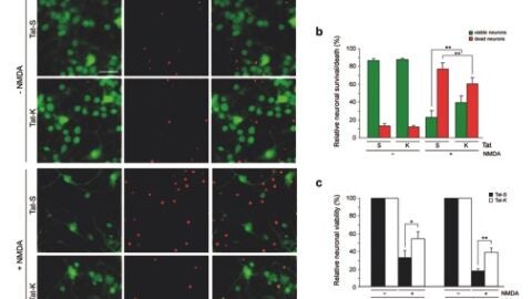 Además, esta estabilización de Kidins220/ARMS en presencia de Tat-K se correlaciona con el mantenimiento de la actividad de moléculas implicadas en la supervivencia neuronal, como ERK1/2 y CREB, fuertemente inactivadas en excitotoxicidad, así como con un aumento significativo de la viabilidad neuronal.