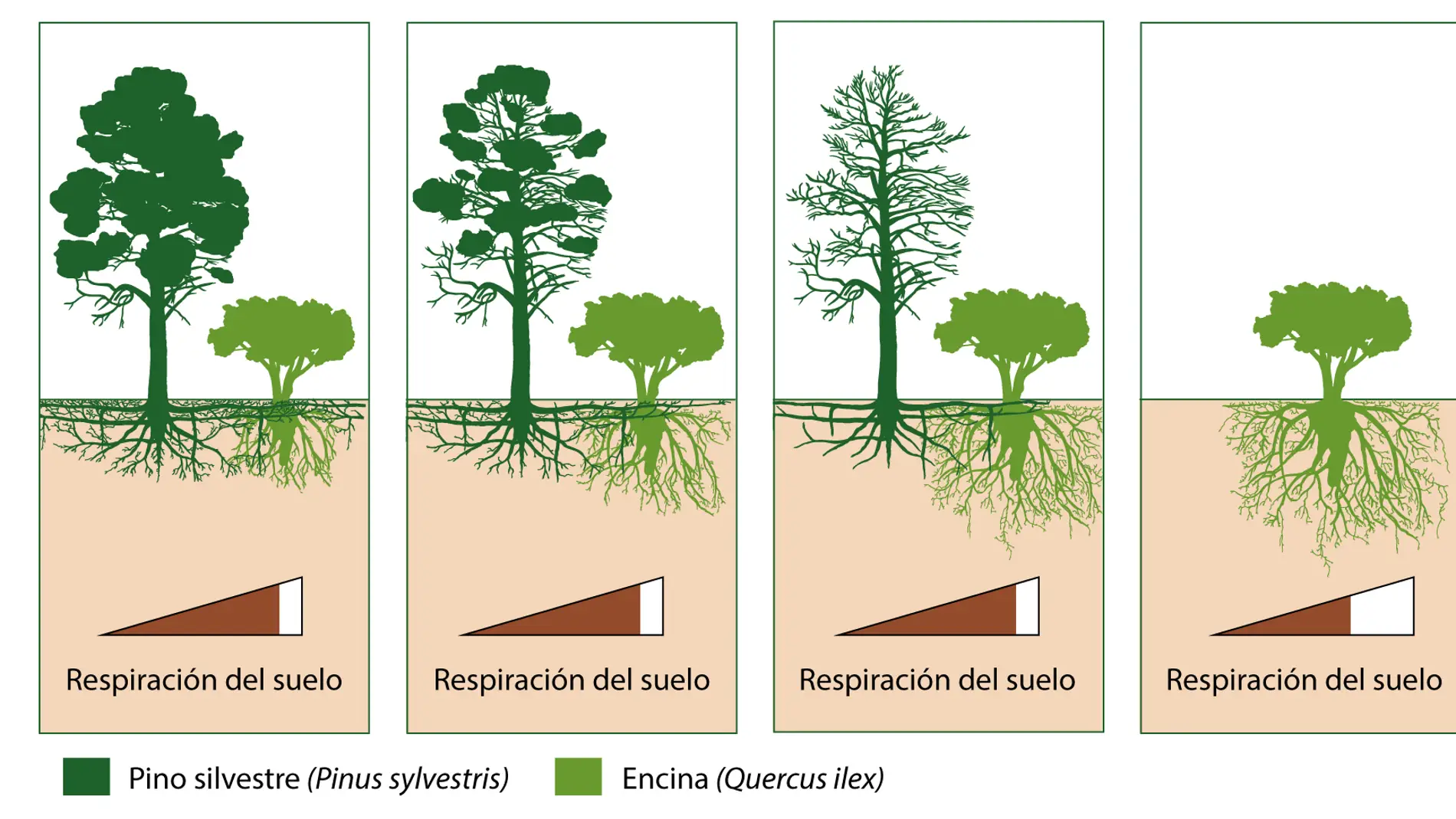 Científicos del Museo Nacional de Ciencias Naturales (MNCN-CSIC) y del Centre de Recerca Ecològica i Aplicacions Forestals (CREAF) han realizado un estudio sobre la respiración del suelo al sustituir pinos por encinas.Según los datos obtenidos, el suelo del bosque con pinos silvestres, Pinus sylvestris, repara en poco tiempo los daños, es decir, presenta una alta resiliencia en sus niveles de emisión de CO2. Sin embargo, cuando los pinos son sustituidos por encinas,Quercus ilex, los suelos emiten casi un 36% menos de CO2 al respirar.