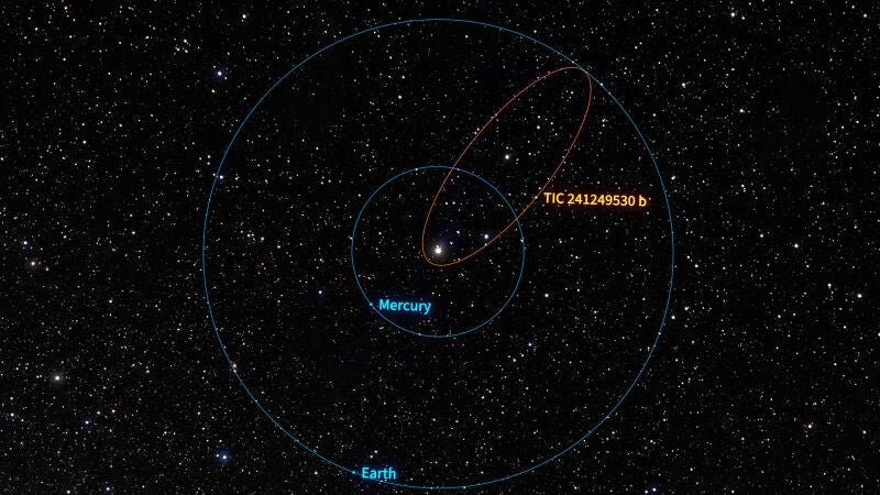 Un nuevo análisis del exoplaneta TIC 241249530 b, detectado por el satélite TESS (Transiting Exoplanet Survey Satellite) de la NASA en 2020, ha revelado que su órbita es extremadamente excéntrica, describiendo una elipse con uno de los ejes mucho mas grande que el otro.