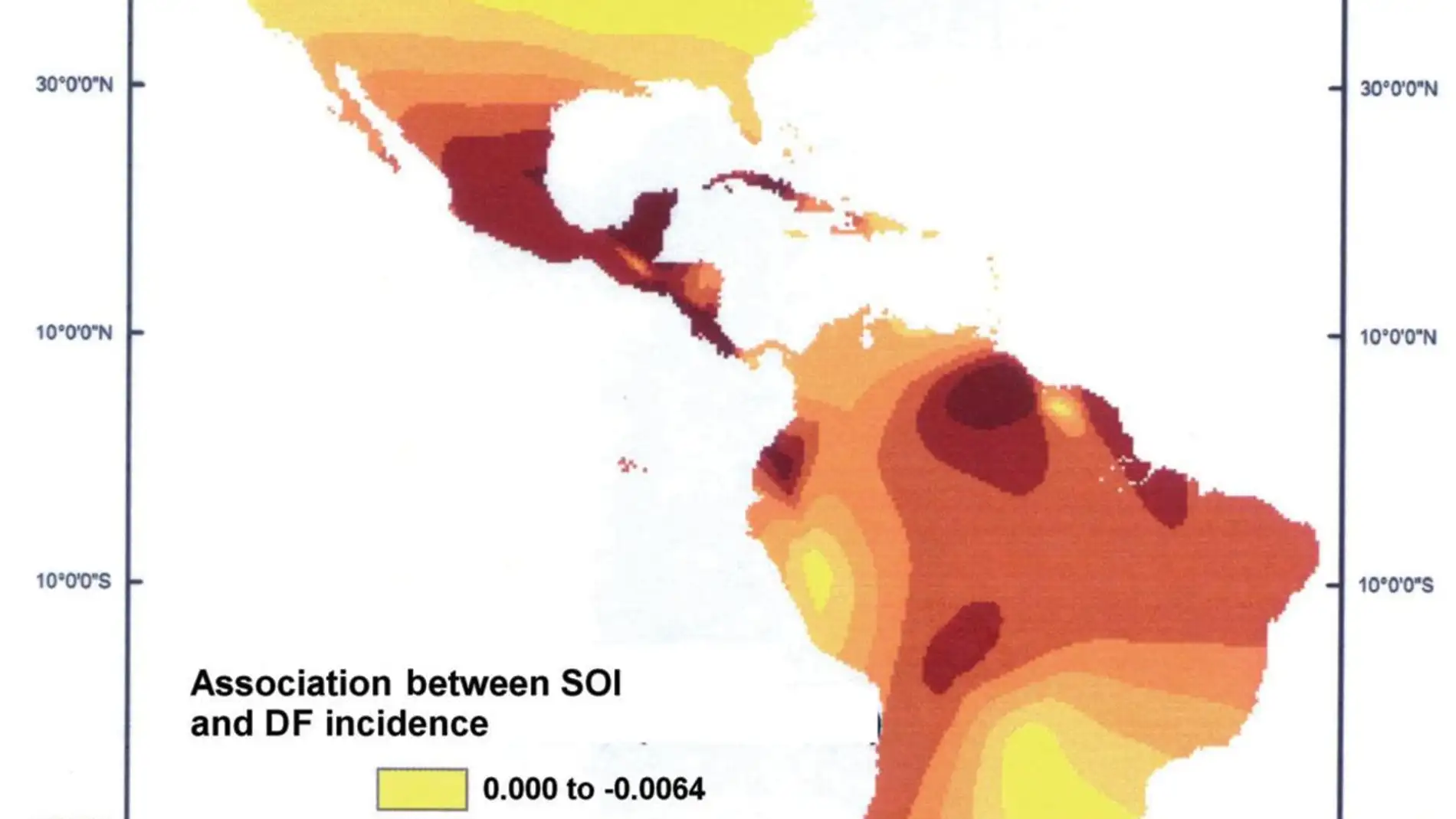 Los países de América Central y el Caribe presentan una mayor sincronía entre las epidemias de dengue y la actividad del fenómeno meteorológico, según los sistemas de información geográfica que han empleado los científicos para visualizar los datos obtenidos, mientras que a medida que nos alejamos de estas latitudes tanto en dirección Norte como en dirección Sur, la relación es menor.