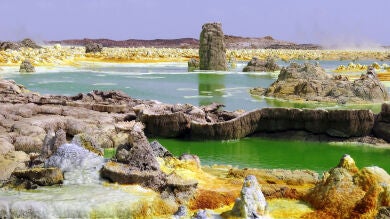 El paisaje infernal de Dallol, situado en la depresión etíope de Danakil, se extiende sobre un cráter volcánico repleto de sal, donde emanan gases tóxicos y bulle el agua en medio de una intensa actividad hidrotermal. Es uno de los entornos más tórridos de la Tierra. Allí las temperaturas diarias en invierno pueden superar los 45 °C y abundan las charcas hipersalinas e hiperácidas, con valores de pH incluso negativos.