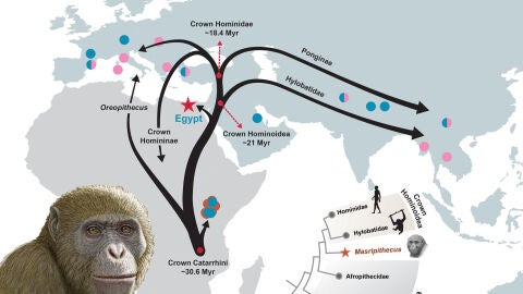 Un equipo internacional de investigadores ha descubierto en Egipto un fósil de una nueva especie de simio, el Masripithecus moghraensis, que vivió en el Mioceno, hace entre 17 y 18 millones de años. Estos restos —parte de una mandíbula— son el primer fósil de simio descubierto en el norte de África.